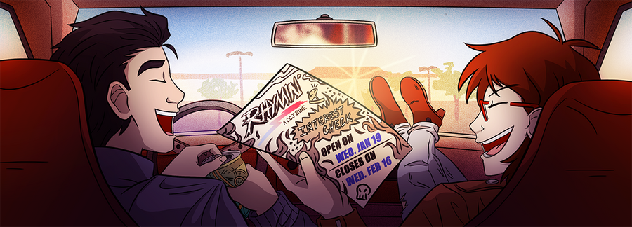 "Writing lyrics is super easy-you just gotta make it rhyme!"Rhymin’ is a charity fan zine celebrating the relationship between the protagonists of Infinity Train’s fourth and final season, Ryan Akagi and Min-Gi Park, through a collection of art and writing inspired by their lives in canon (pre-train, on train, and post-train!)All proceeds after production will be donated to the NQAPIA (The National Queer Asian Pacific Islander Alliance) which is an NYC-based non-profit that provides support for and fights for the rights of the LGBTQA+ Asian and Pacific Islander diaspora.Check here for our detailed Q&A!RETURN TO HOME